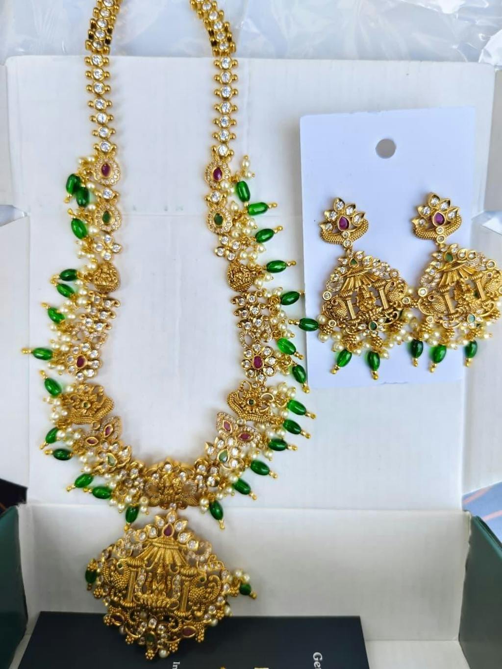 Pair these necklace and earrings with Traditional Temple Jewellery Bangles.